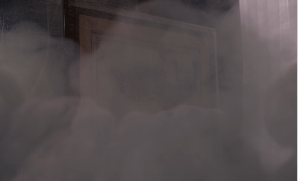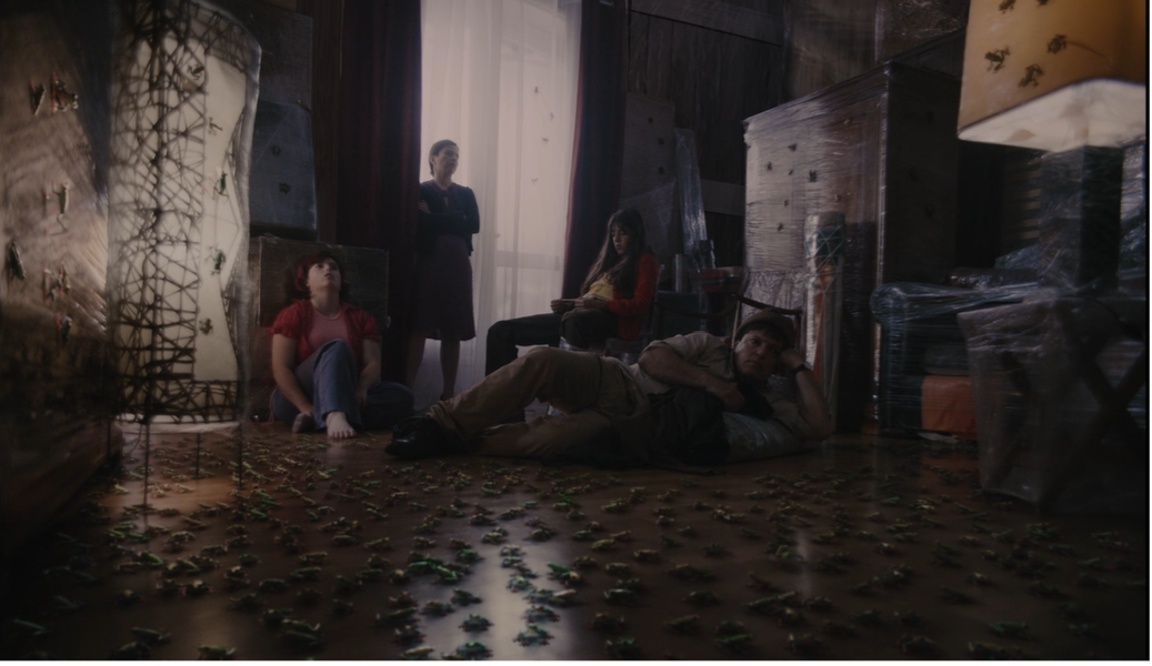 And yet, the frogs from Home are not ghosts, however tempting it would be to read them that way. Not only is their appearance in the film’s plot within the realm of possibility,24 but the brightness and liveliness of their colors (red and green) contrasts with the faded colors of the apartment, the objects wrapped in plastic, the translucent curtain that appears repeatedly in the middle of the shots, and even the clothes of the parents, the brown and beige hues of which allow them to easily blend in with the furniture (Figure 5). This faded aesthetic is the product of a chemical process called bleach bypass, a process that López performed digitally and that superimposes a black-and-white image over a color image. The resulting images usually have reduced saturation, increased contrast, and graininess.25 The process of creating the film’s images and the aesthetic they produce thus turn the apartment into a ghostly space that is noticeable as such precisely because of the saturation of the frogs, understood both in terms of their color and in relation to their invasion of the apartment. It is thus not the frogs that are the ghosts of Home: the ghostly is in everyone and everything surrounding them. And, rather than serving to bring the ghostly place and the people in it “back to life” the way nostalgia imagines the lost past, if recovered, would, the omnipresence of the frogs underscores the paradox of having so many things that speak of the heavy weight of a history—a familiar, individual, collective, and national history represented by lamps, paintings, bedframes, etc.—and nevertheless being, in this foreign place they have to call home, what Omar Kasmani calls “short of history,” which means to no longer have narratives to inhabit, to have no clear way (anymore) of “being and belonging in time.”26