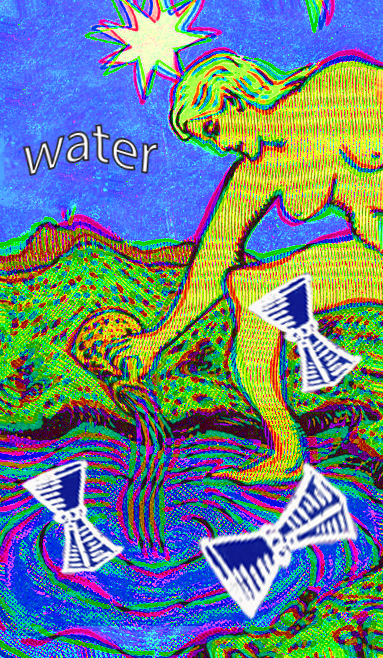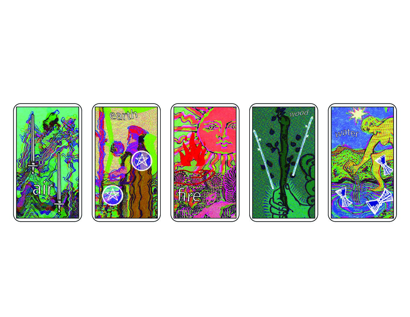 These remixed Zener cards feature classic Rider-Waite tarot iconography. In the Rider-Waite deck, the five elements reflect a sense of equilibrium: living beings rely on a balance of the different elements to survive. On the worldly plane, they also represent different aspects: water for emotions, earth for material goods (like money), fire for creativity, air for rationality, and wood for structure and hierarchy. In other pharmacosmos, the balance of elements signifies homeostasis or health.7 In a time where the insurable universe seems to be disappearing due to unpredictable elements, we use these modified Zener Cards to remark on the continued, technological desire for control and predictability. With these remixed Zener Cards based on the classic Rider-Waite tarot iconography, we invite you to use them as an ESP card-guessing test, for predicting places still in the insurable universe, or for playing a game of poker.