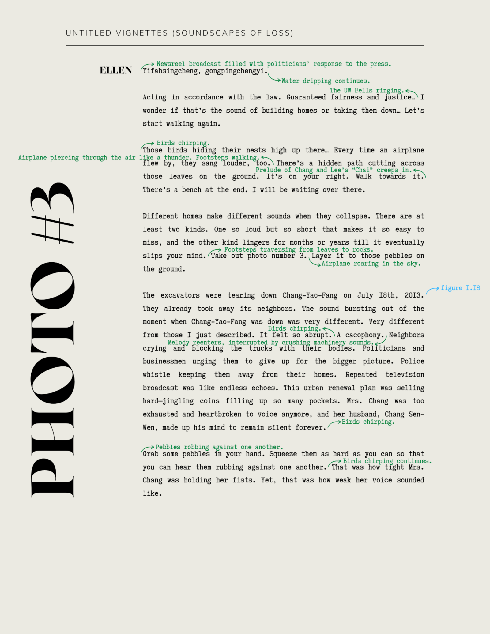 Untitled Vignettes (Soundscapes of Loss) is a site-specific audio walk centered around the theme of displacement caused by misleading policies that falsely promise a better future against the backdrop of Taiwan’s long-contested (post)coloniality and its quest for a collective sovereign identity.6 It seamlessly blends spontaneous reflection with historical narratives, personal recollection, music, cinematic soundtracks, and local soundscapes. This project transforms my digital encounters with the societal turmoil in Taiwan into an interdimensional experience through a series of (audio)visual storytelling, listening, and viewing. To fully engage with the effect of Untitled Vignettes within the framework of this cluster, the Figures—a script, a photographic image, an (audio)visual excerpt, or a combination of them—are intended to be experienced sequentially alongside the written narrative as presented in this piece. Through the mode of walking with (audio)visual technologies, particularly cameras and the sounds and images they capture, whether still or in motion, how can we reshape sensorial experiences of sight, sound, smell, and even touch as a means to create an affective site where we can form our own relationships with the moving worlds unfolding before our eyes and ears (Figure 3)?