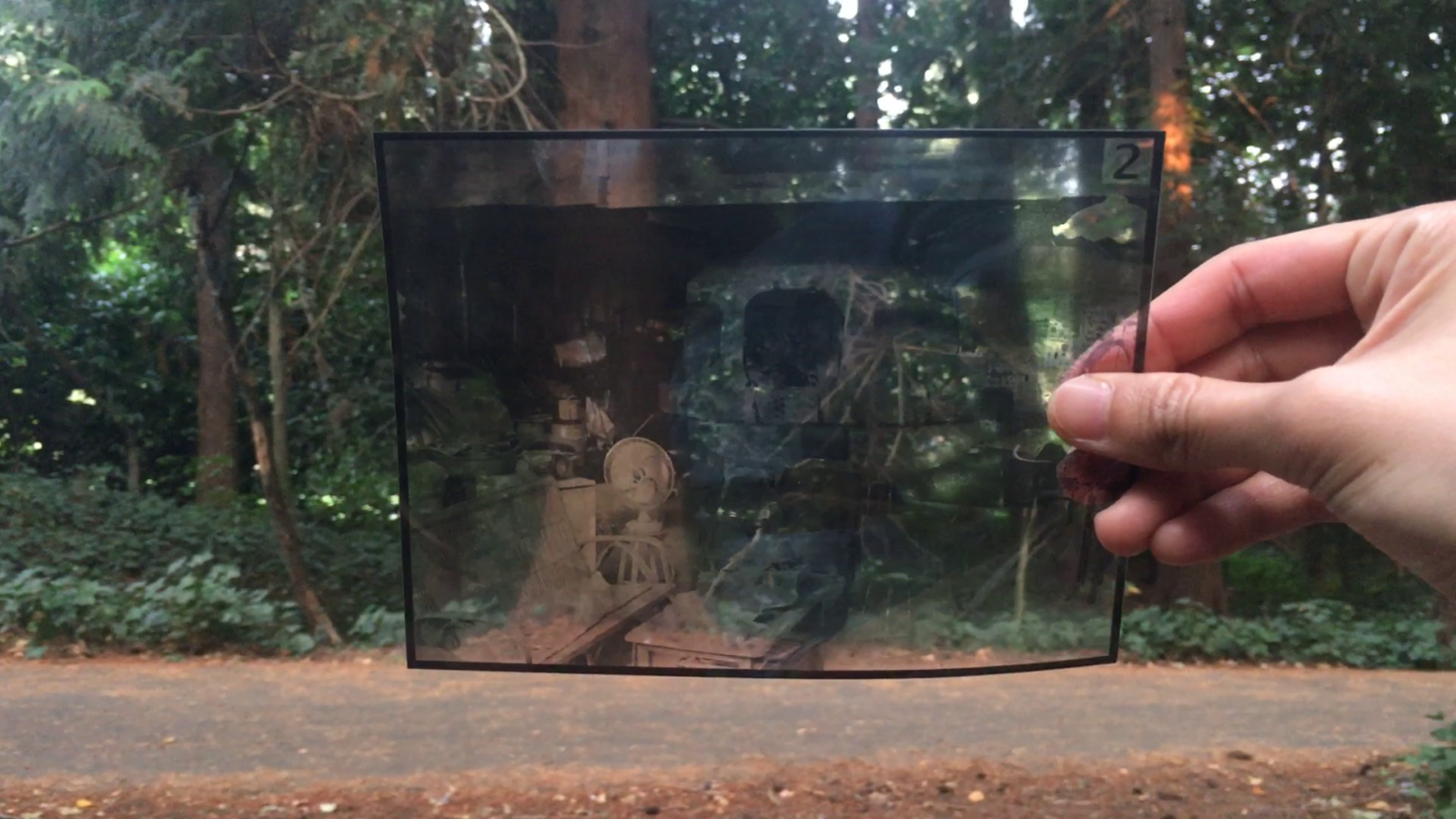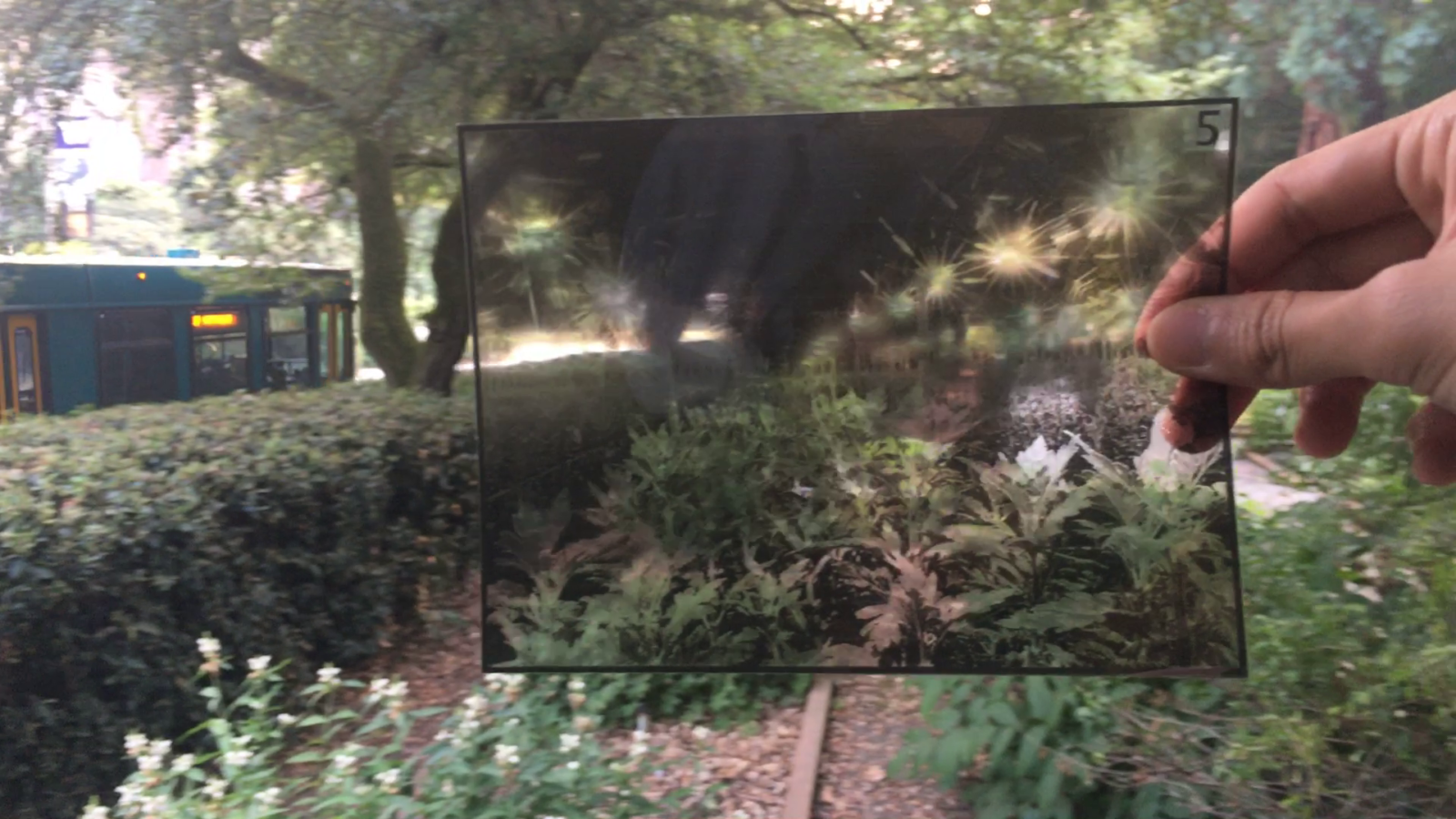 Amidst the peak of the pandemic in 2020, a New York Times article coined the term, “audio plays,” to describe what has been known as audio walks or sound walks—“outdoor, screen-free (as opposed to the Zoom meetings), participatory shows, but in a solitary and covert way.”20 Combined with memories akin to (e)motion pictures—a medium that not only “dwell[s] in motion” but also “‘moves’ us” emotionally through “its ability to render affects and, in turn, to affect”—printed on celluloid films that screen, much like staging, the virtual world to us, Untitled Vignettes, similarly, crafts a cinematic experience in broad daylight (Figures 7a and 7b).21 Completely transforming and affecting the location where our imaginations traverse, the sound collage, acting as a filmic soundscape for the real world, turns the garden into a physical cinema where “both audience and exhibits move.”22