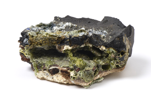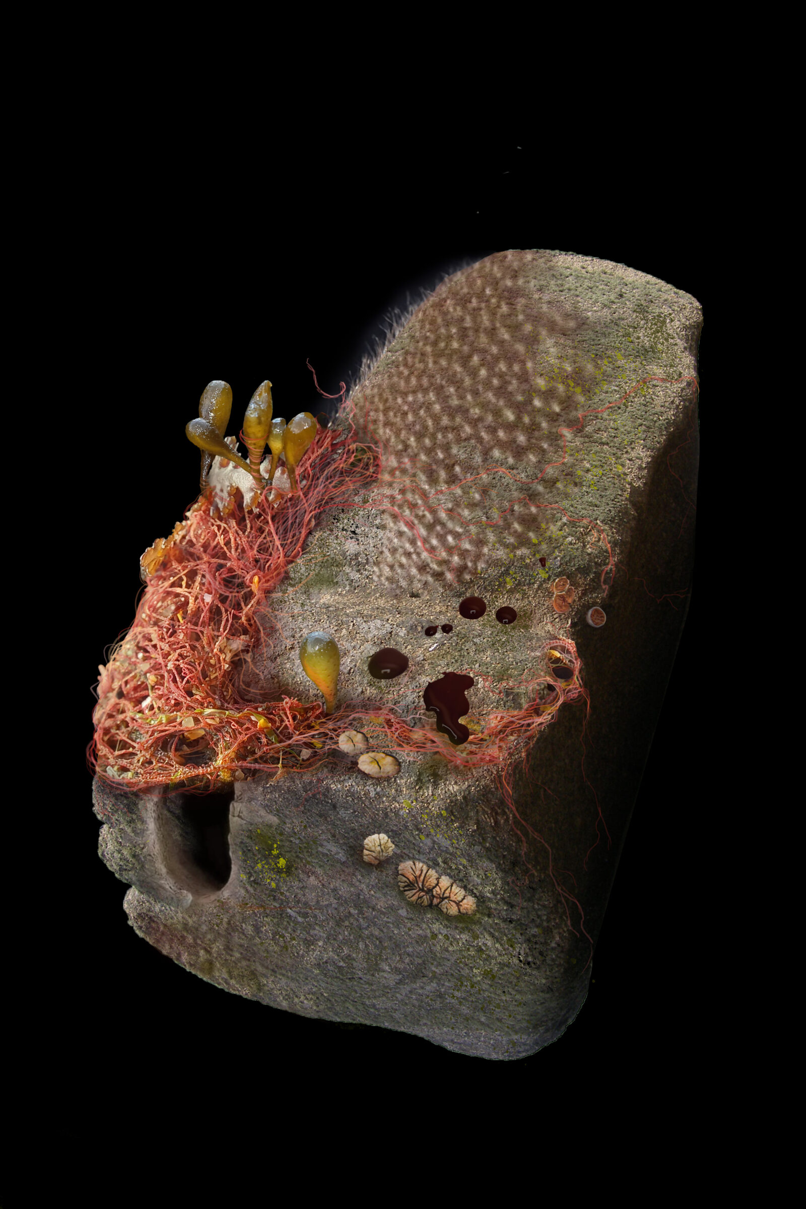 As a methodology, the artist applies what Baptiste Morizot calls the arts of political attention: her practice revisits and problematizes the fragility of ecosystems based on geopolitical aspects and creates new sensitive relationships with the environment.9 She reinvents new possible agents that could be generated spontaneously beyond the artistic sphere if extractive or abusive practices were to continue and, in doing so, she creates other new territories that are but new ways of inhabiting and engaging with the environment.10 The artist invites us to shift our perspective while exposing the physicality of the planetary crisis. She works with the concept of speculative geology as a strategy to create post-human scenarios by considering the resulting mineral conglomerates as fossils that preserve the present for future times. The action proposed by the artist takes a reverse direction: instead of deciphering the history of previous times by means of archaeological methods applied to a given geological or archaeological piece, she herself creates plausible, hopeless artifacts/scenarios for the times to come. These fossil projections, as the artist calls them, are not intended to explain processes or to provide a dating of stratifications, but rather to demonstrate temporal deviations, variable rates of change and abrupt events.11