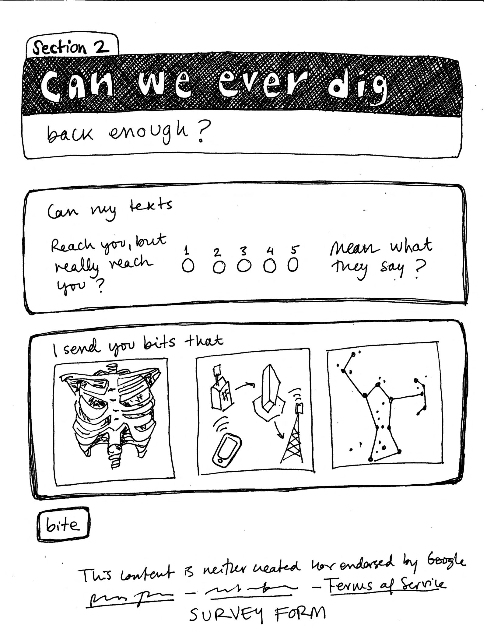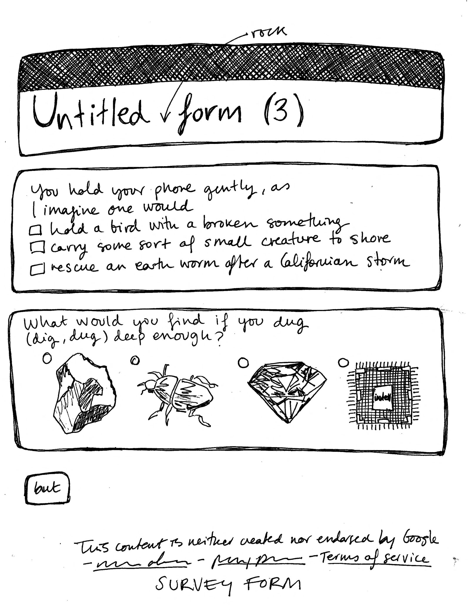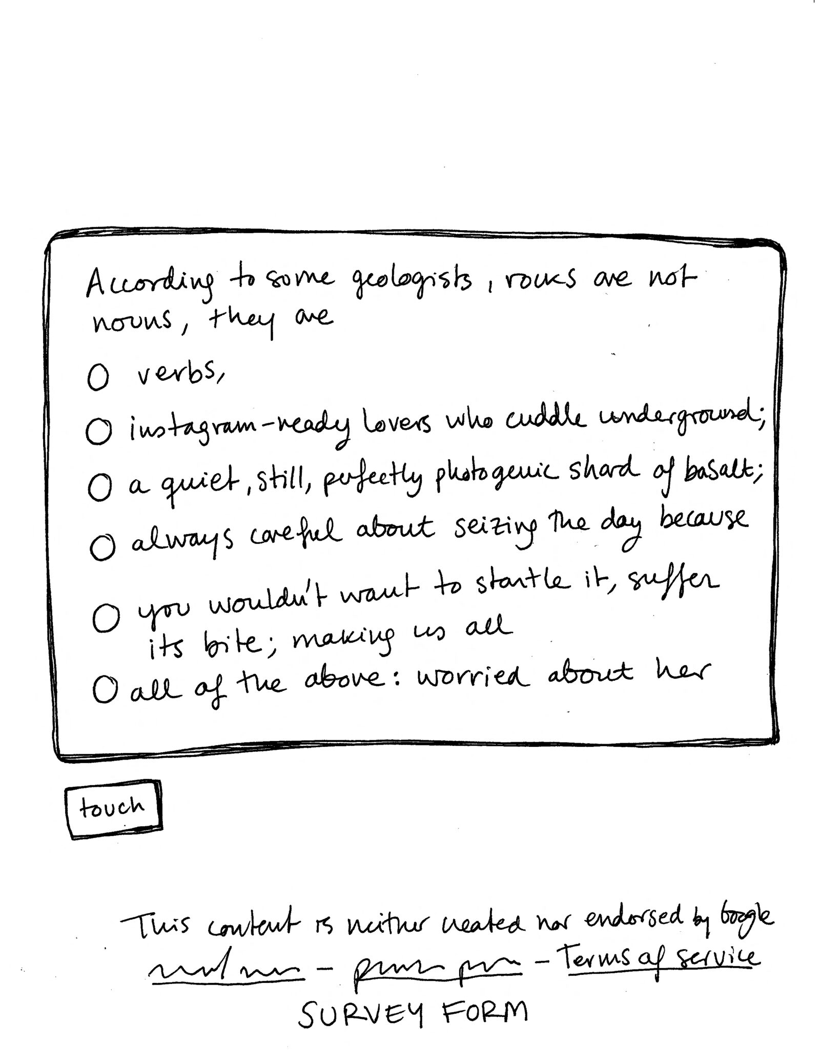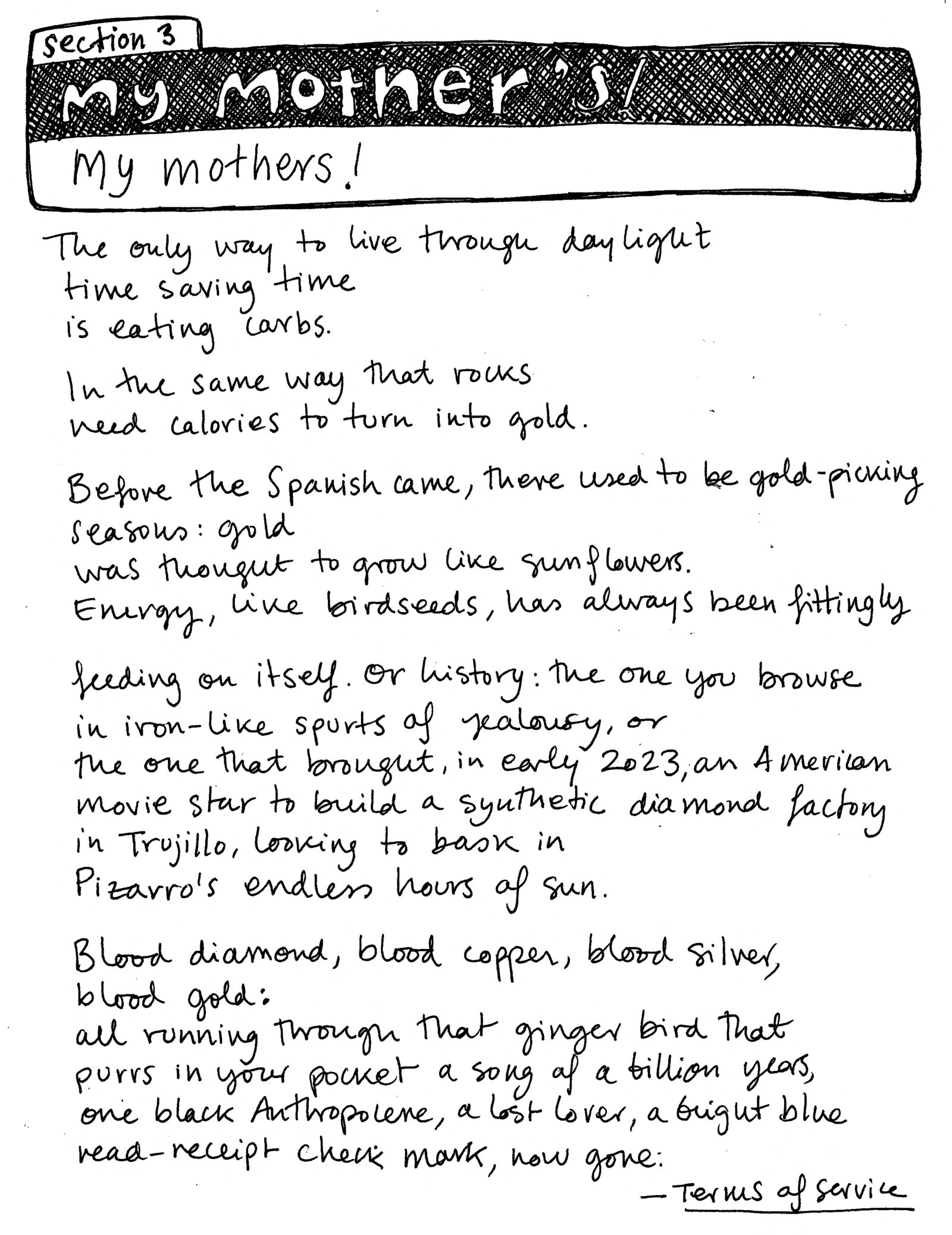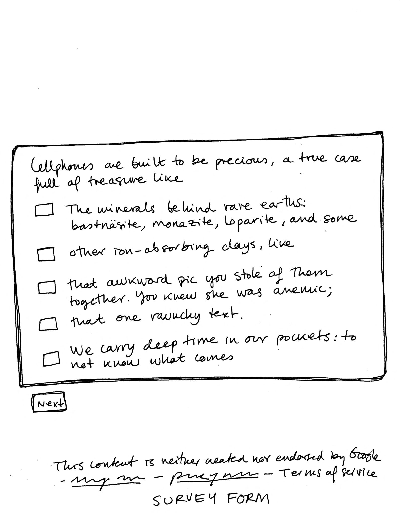 Poetic Statement: In early 2020, before the COVID 19 pandemic hit our Californian shores, I was working on a digital poetry project at UC Berkeley’s Arts Research Center. Corporate Poetry was intended to explore how corporate language related to those other corpora that is our bodies, through the creation of a series of interactive poems that mimicked online survey forms. I built a few digital poems that aimed to defamiliarize our dialogue with platforms like Google Forms, Survey Monkey, and Zoom, and I subsequently used the data that these survey-like poems generated to build even more survey-like digital poems. “Terms of Service: Untitled (rock) form 3” is an analogic expression of the same ideas, this time focusing on the tension between survey logics, created to gather and analyze user data, and the stasis and impermeability of a printed page, where survey rhetorics are flattened and dated in an inoperative manner. My interest in digital materiality here expands to an exploration of the larger material networks that make digital objects possible, casting a large web of connections that link early modern mining to the contemporary race to control rare earths and build synthetic diamonds to build computers and cellphones. “Terms of Service: Untitled (rock) form 3” is the third part of a hand-drawn/written tryptic poem structured around Google Forms templates. “Report Abuse: Untitled (tree) form” was published in Emergen/cy (Arts Research Center, 2021) and “Privacy Policy: Untitled (atom) form 2” appeared in the Journal of Spanish Cultural Studies, vol 24.1 (2023).