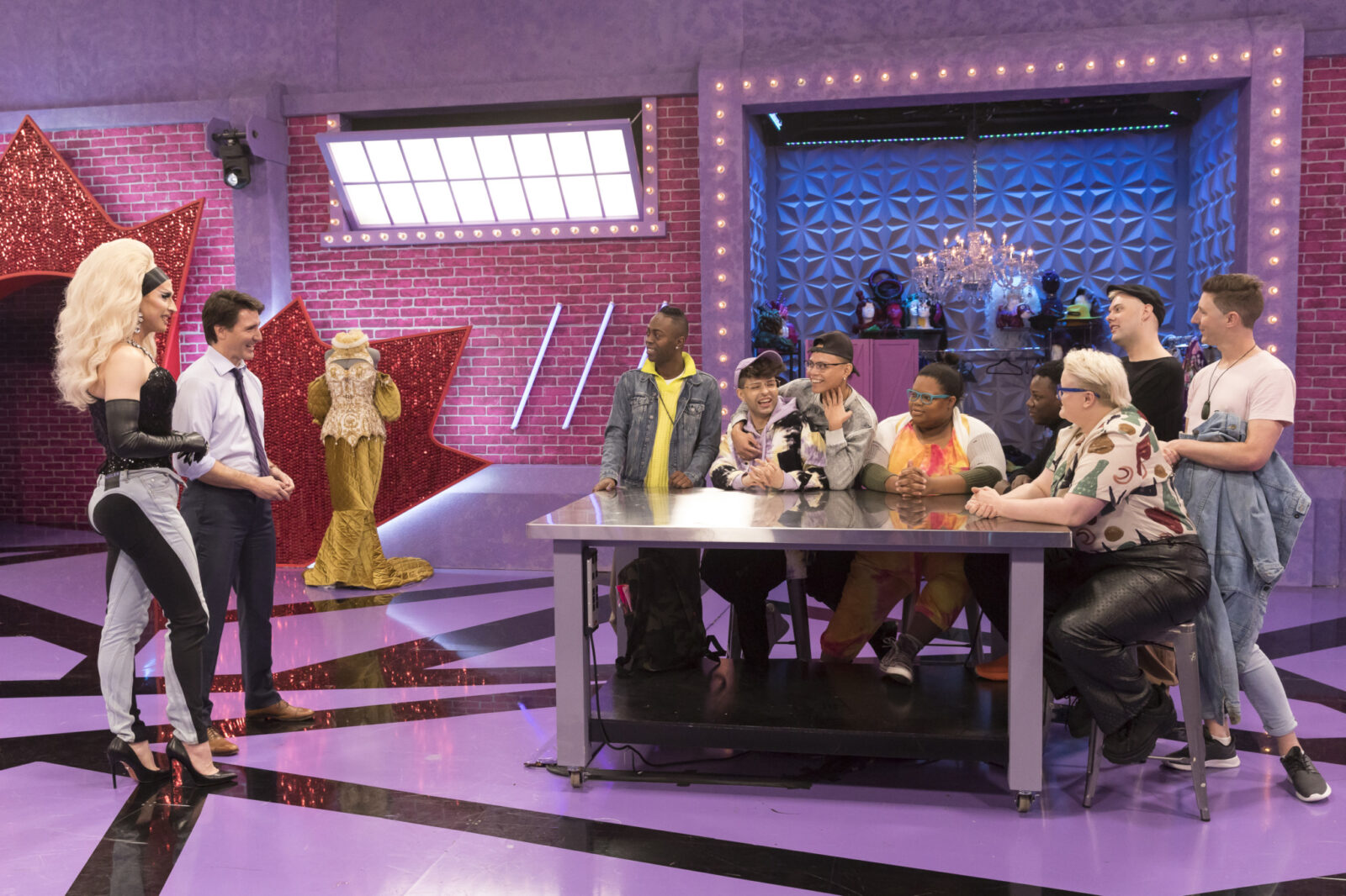 In comparison to AOC’s engagement with the queens (she also appears for an extended period conversing with them on the back-stage spin-off RuPaul’s Drag Race: Untucked12), Trudeau’s appearance is more stilted, awkward, and self-congratulatory. He does not serve as a guest judge but instead makes an appearance during the Werk Room segment of the episode. While the contestants are chatting in the Werk Room, host Brooke Lynn Hytes joins them in full drag to announce that Trudeau has come to visit them, ostensibly to offer a “welcome” to the non-Canadian contestants of the season.13 After being introduced to each contestant by their drag name and country of origin, Brooke Lynn underscores the significance of the moment: “This is ground-breaking, the first ever world leader to visit a Drag Race set”14 followed by the contestants applauding. Afterwards, American contestant Ra’Jah O’Hara, in a confessional, says “To have a world leader in the Werk Room talking to us, how amazing is that? You better work, Justin Trudeau!”15 Rather than seamlessly becoming part of the show’s usual rhythms, Trudeau’s appearance marks a disruption of the typical Drag Race episode. His segment is extremely self-referential, as though he is appearing on the show specifically to discuss his appearance on the show. It would seem that, by walking into the Werk Room, he has (to put it bluntly) done a significant act of queer activism!