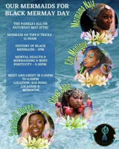 I am a Black Studies scholar and professor who specializes in African American literature and speculative cultures. My current project is a study of African diasporic mermaid lore in conversation with Western humanism and the Anthropocene. But in the mermaid community, I am known by my “mersona” Mami Melusine and as host of The Merwomanist Podcast, a show about Black mermaids, fantasy, and aquatic culture. As a mermaid scholar, enthusiast, and content creator, I am used to people, when they first hear about the work that I do, bringing up the live action The Little Mermaid. While my work is not primarily inspired by or focused on The Little Mermaid, I cannot deny that I and other Black mermaid creators have used the film’s release in May 2023 as an opportunity to draw attention to the bigger story of Black mermaids. I thought the best way to talk about different aspects of the Black Mermaid Renaissance would be to chronicle my experiences and travels throughout the month of May. My busy Mermay exposes the richness and depth of meanings that mermaids hold for the different communities of Black people who love, revere, create, and embody them.