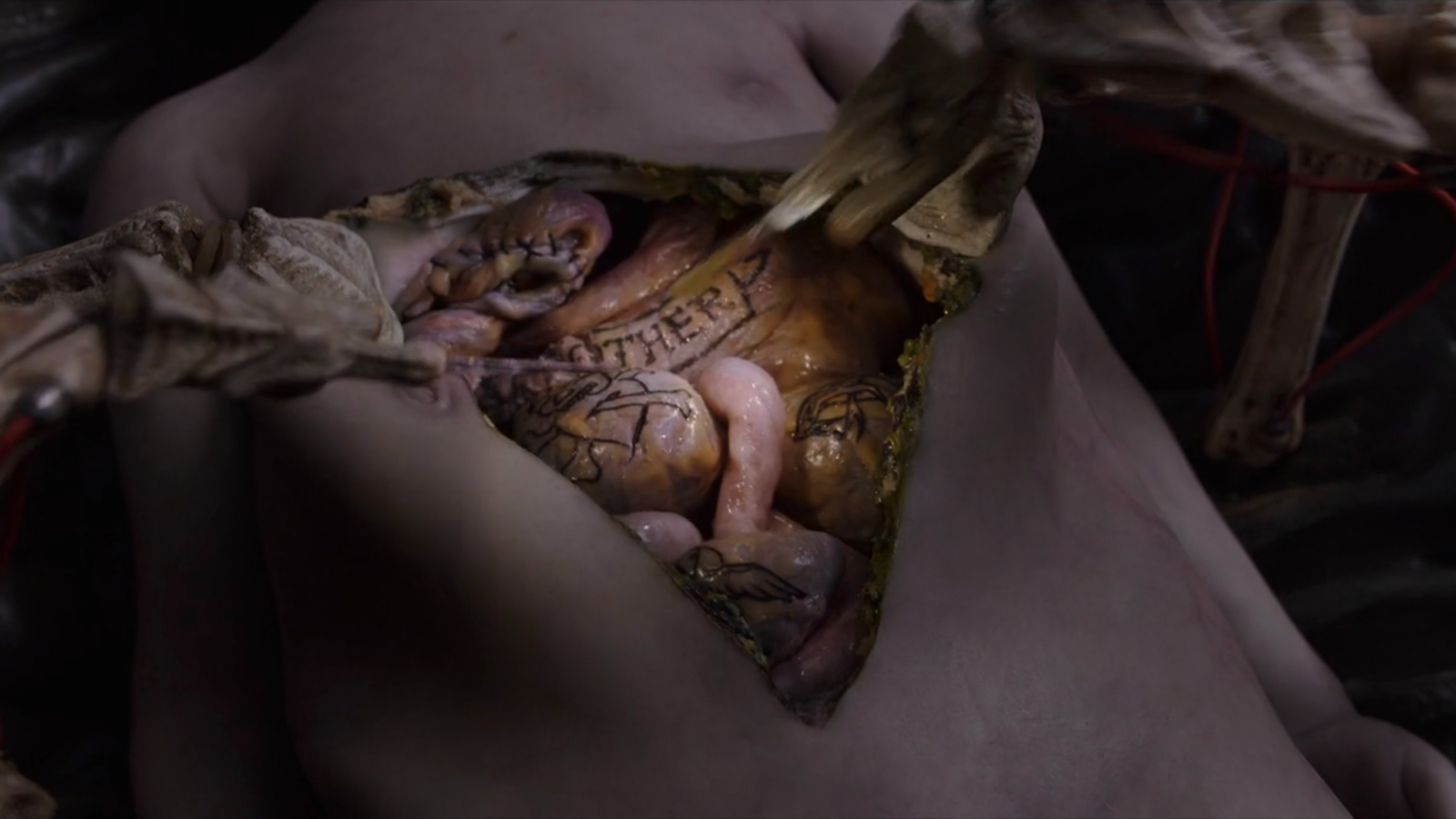 There is a dark irony in describing the corpse of a dead child as “a poem,” as well as considering the act of analyzing poetry in the classroom to be an autopsy. But this irony speaks to a new path forward for poetic reading. The language that describes the act, using a machine to cut open a corpse, is far from the act itself and what we find inside of the dead child is far from an enigmatic “meaning locked inside of a poem.” Instead, it is a morbid joke. Rather than a digestive system evolved to consume plastic, the audience finds typical human organs with clichéd tattoos, in this case, with the iconic and ironic word, “Mother”: ironically the child’s killer. If the child’s corpse becomes a poem through autopsy, “the act of looking closely with one’s own eyes,” it is telling that this discovery is a linguistic joke based on the divergence between signifier, the word “Mother”—and signified—the life-sustaining organs of a child killed by his mother.