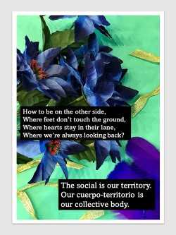 As Verónica Gago argues, the concept of cuerpo-territorio highlights the impossibility of separating the individual from the collective body as well as the body from its territory, and deliberalizes “the notion of body as individual property” to instead focus on our interdependence.4 This diasporic territory is not a physical space but a social one. It is movable but it supports us. It provides grounding for our actions.
