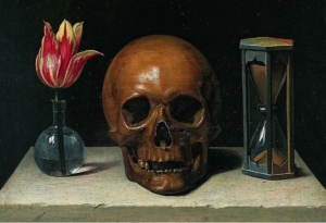 The effect of this fragile meeting of death and decoration is to produce a form of memento mori, an art object upon which to meditate on the transience of human life. Traditionally, the memento mori has operated as both ornament and prop, taking the form of either a real skull or a two or three-dimensional rendering in paint or wood or stone; a famous example of a painted memento mori is Philippe de Champaigne’s 1671 Vanitas (Figure 3), a painting which frames the human skull with two other transient objects; a still life of a flower and an hourglass representing the sands of time.3