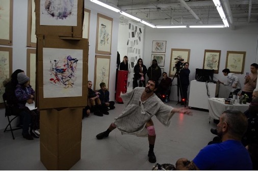And this is also how I accept the invitation to be “viscerally touched and turned over by [the] words” of Left Turns and the exhibition and performances of “Sensory Riffs & Visceral Turns: From Syllable to Sound to Print,” which I visited at the Ortega y Gasset Projects space in Gowanus, Brooklyn on an icy December night.