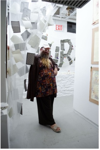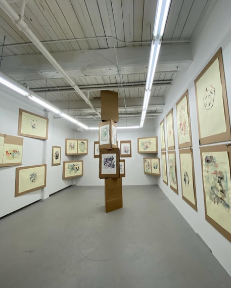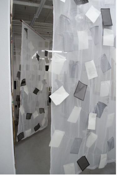 The space—bricks and plumbing white, floors poured gray cement—softens with chiffon curtains fluttering against their gentle stitches, remnants fashioned into hugging threads leading back to friendships whose shapes fill out the loves one could be born into or forge or hope for. You taught in the classrooms next to one another—Ruiz and Vernola, the students called you. Dusty, you teach too, and sometimes a student’s parents will attend one of your performances and the student will tell you in the morning. This white, grey, softened room fills with teachers pulling us close to how closeness in thinking does not mind distance—of years, of quiet, of rhythm, of language. What teachers know is that students and experience lead, and teachers—in the best case—mind timing. Someone asks, how would you teach this book, these paintings together? And all answer almost together: tear the pages out, destroy the painting and try to put it back together. Dissection but not for mastery. Toward making more forms from pieces.