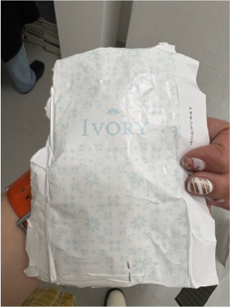 On a small table near the nodding fan is a bowl of Ivory soap wrappers refashioned into calling card mementos. They ask, in writing, if we have questions. The scent—mass-produced clean—is remade here into intimacy’s lining. Bars of soap line the wall in neat and not neat stacks of white on exposed brick painted over white. The wrapper should ask if we have anything other than questions.