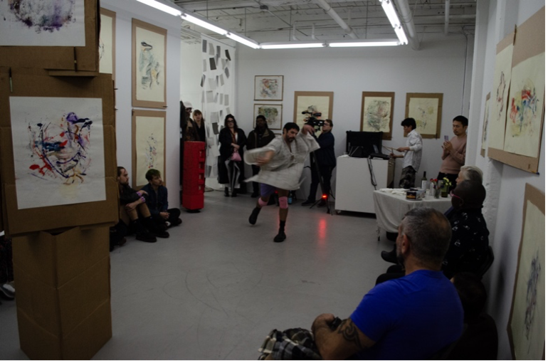Before Estado Flotante reads to close his and Erica’s performance-collaboration, they join us in the space with her sonic score, anchored by a thumping drum machine. (Ruiz writes with Gressman’s work in her forthcoming Tears for Tears: Aesthetics in Grief Minor.) Estado Flotante’s lunges and curvings, feet now pointed then square, grab at the pivots, enlivening the paintings, not as echo, not as answer, but more a steady, studied disarticulation of the distances we think into a place, as they bend into and away from the seams of the tunic marked by Childers with a stamp that reads turn. They become stuck, doubled over, then hop, one low smile interrupts, and what’s left is an entreaty of breathing heightened by having worked new room from this room.