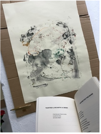 Each monoprint twirls from one of Left Turns’ fifty-one poems. Fifty-one because Puerto Rico is held un-sovereign. The prints here are mounted onto cardboard: the classroom bulletin board and the time for crafting before lunch are here too, just like the remnants of watercolor on plexiglass pressing paper, onto one print then the other, leaving “leftover” marks from the previous on those that follow. It was never only our classroom. These marks can make connections—across prints, across space—real. And it is not the only way.