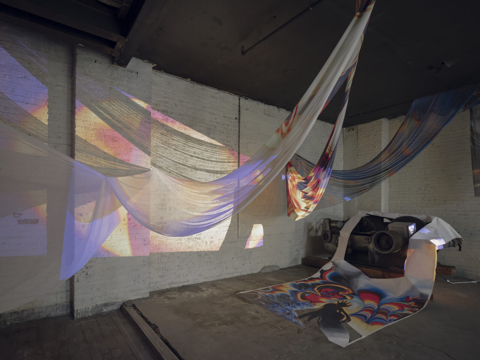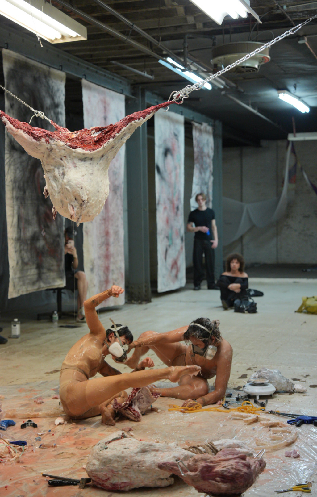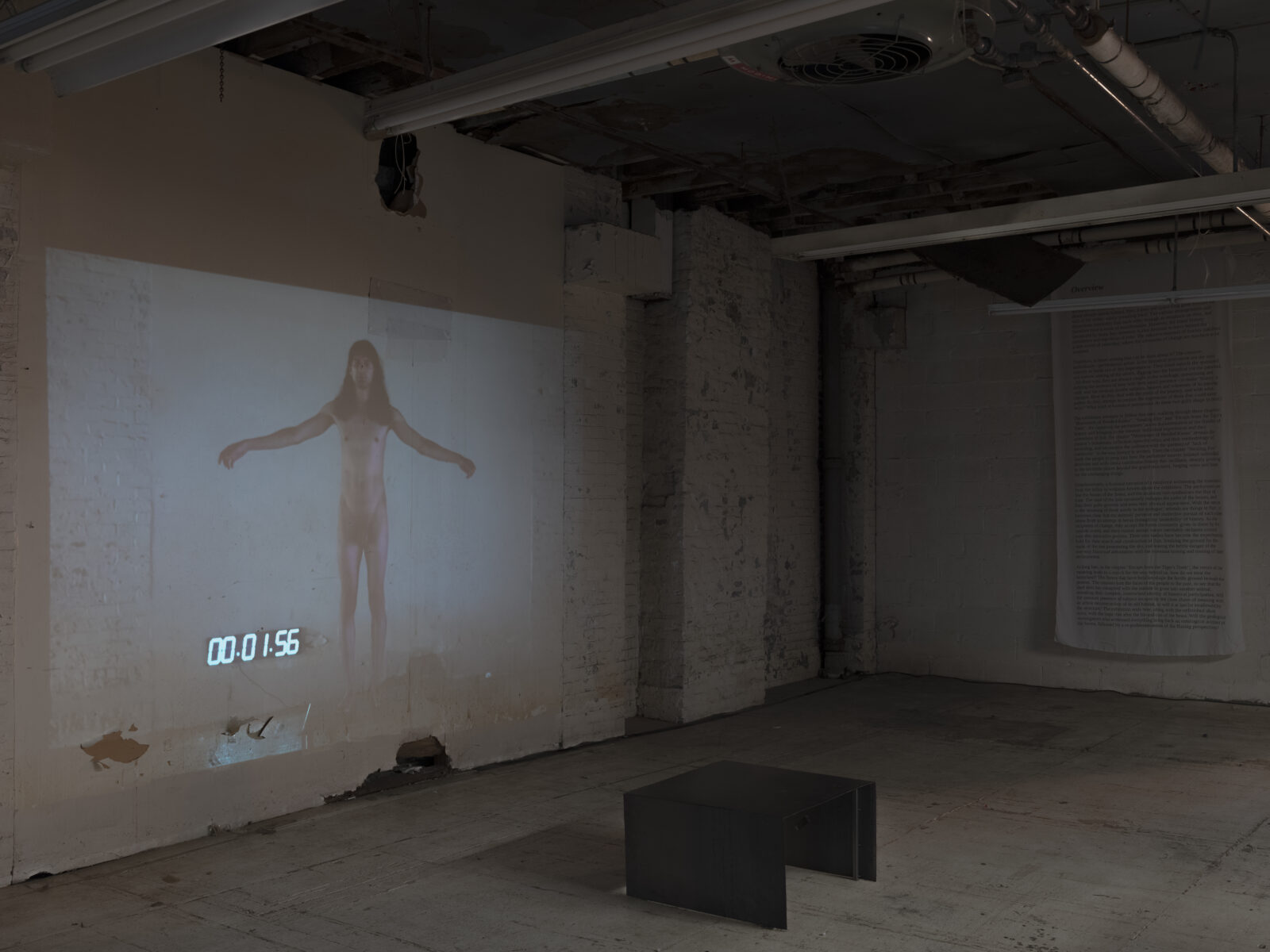New Uncanny Gallery is an unconventional—and, well, new—space sitting in West Harlem. An artist-run, artist-directed transdisciplinary exhibition space, it showcases experimental works pushing the boundaries of traditional art genres. Torsos in Rain marks the gallery’s second installment, continuing the space’s mission to explore the intersection of art, history, and performance. Jiang transforms the industrial space both visually—through softly illuminated fabrics, subtle color schemes, and immersive projections—and rhythmically, by carefully pacing the arrangement of the pieces. The raw, unfinished elements of the space are juxtaposed with flowing textiles and dynamic installations, making the gallery itself an active participant in the conversation about history and transformation. This spatial transformation allows the performances to unfold organically, enveloping the audience and drawing them into the work.